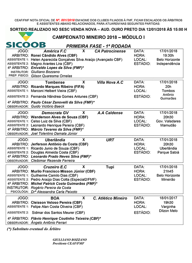 (12/01/2018)Faltam pequenos detalhes para a abertura oficial da temporada de futebol em 2018, mas uma coisa já é certa, a escala de árbitros para primeira rodada do Campeonato Mineiro Sicoob. Nesta sexta-feira (12), a Comissão de Arbitragem realizou o sorteio que definiu os árbitros para as seis partidas da rodada de estreia da competição.