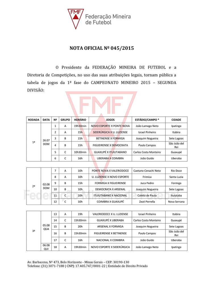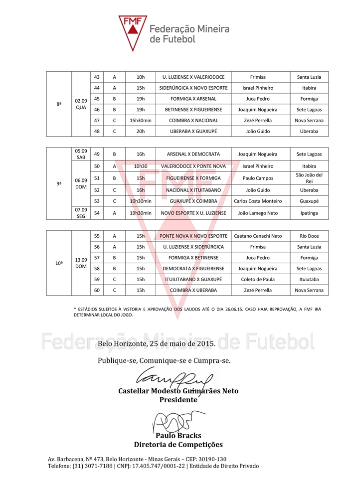 (25/05/2015)A Diretoria de Competições da FMF divulgou a tabela de jogos da Segunda Divisão do Campeonato Mineiro.